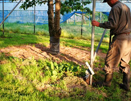 高い木の上ですでに摘み取り作業をはじめていました。「もぎとればいいというものではないんだ。」 さくらんぼの軸へかける力加減まで