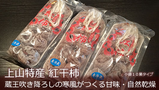 紅柿の干柿、紅干柿は山形県上山特産品。なかでも一目おかれるのはほんの一部の地域のものです。甘くてやわらかい紅柿(紅干し柿)これまでの干柿のイメージがかわります!紅柿販売(伝統の紅干し柿産地直送) 山形県上山特産品 |