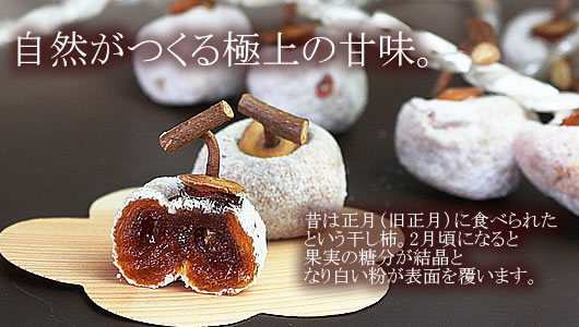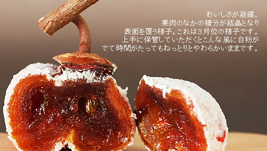 ![]() *すべてが写真のようにならない場合があります。干し柿によって おいしさが濃縮し黒さが強くでるものもあります。 温度管理に注意していたくと 1月半ば頃から徐々に 白粉がでてきます。画像は2月〜3月の様子です。 うっすらと白粉が覆う1月頃が一番おいしい時期です。(果実の中の糖分が結晶となり外にでたものです ) お届けの12月下旬はうっすらと粉がではじめる頃となります。