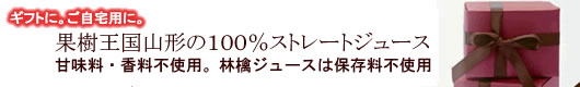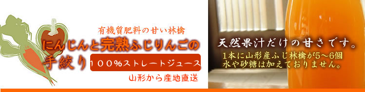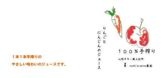 | 果樹王国山形、蔵王山麓のおいしい空気に囲まれた果樹園よりお届けします。健康第一をモットーとする生産者がまじめに栽培したおいしい林檎にんじんをブレンドしたやさしい味のジュースです。 |