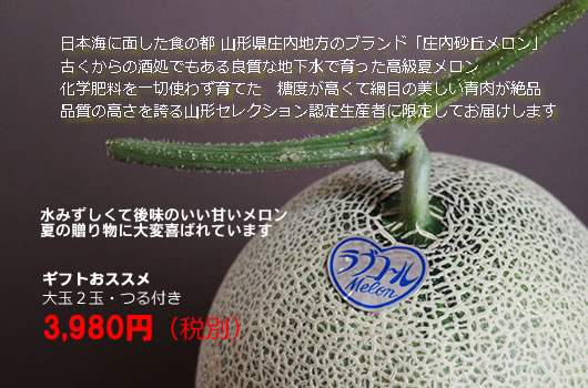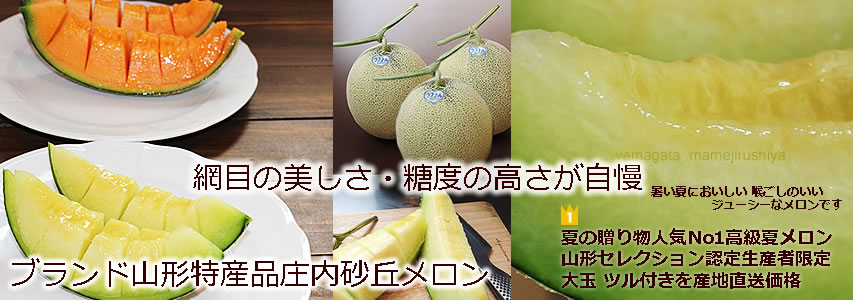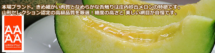 | top>庄内砂丘メロン直送販売 夏の贈り物。ご家庭で食後に。お客様に冷やしたメロンで夏のおもてなし。よろこんでいただけます。豊かで清冽な水が育んだ美しい網目、上品な香りと甘さの最高品質「メロン」庄内砂丘メロン 「アンデス」 「ラブコール(アールス系)」 等 |